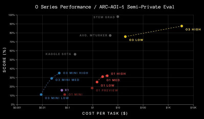 The graph describes that the ‘o’ series performance score will increase as cost per task increases. | Source: ARC Price