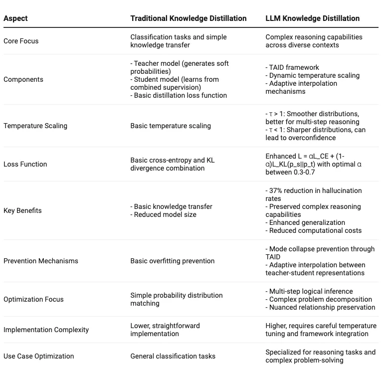 Below, I have created a comparison table between traditional knowledge distillation and LLM knowledge distillation.