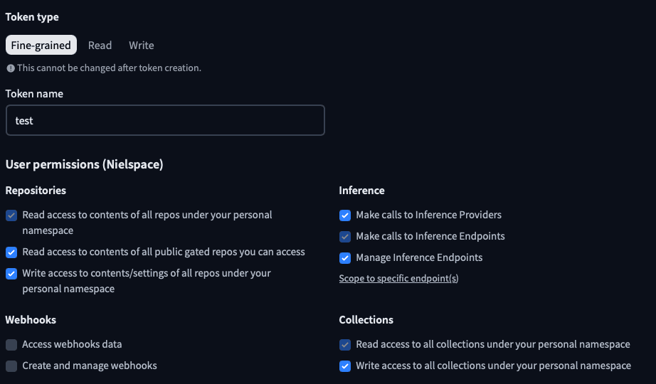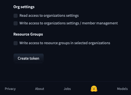 - Then, you will need to write the token's name, and as shown in the image below, just select all the checkboxes. This will allow you to access the model from the Hugging Face API.