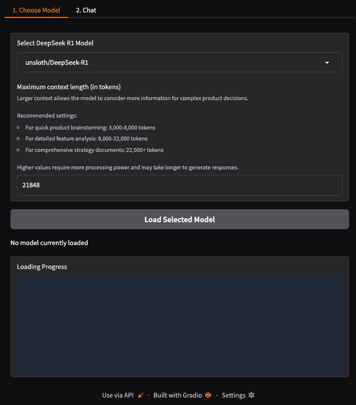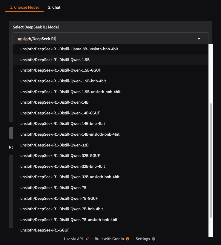 Select any DeepSeek model from the dropdown menu. In this case, I choose unsloth/DeepSeek-R1-Distill-Qwen-1.5B. It is small and works well with less resources.
