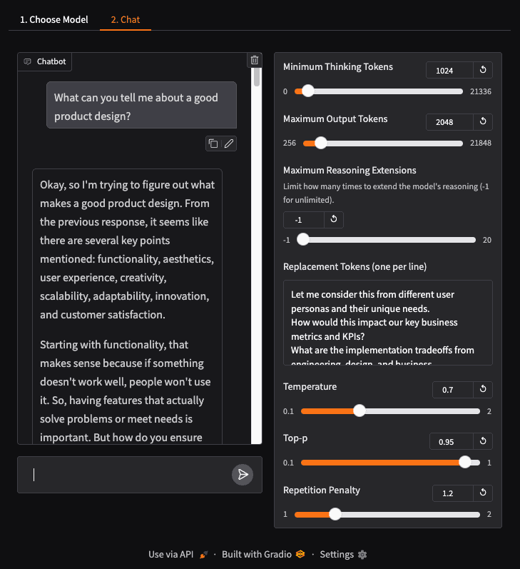 These parameters let you fine-tune the reasoning process for different types of questions. Lower temperature values (0.1-0.3) create more focused, deterministic thinking, while higher values (0.7-1.0) encourage more creative exploration.