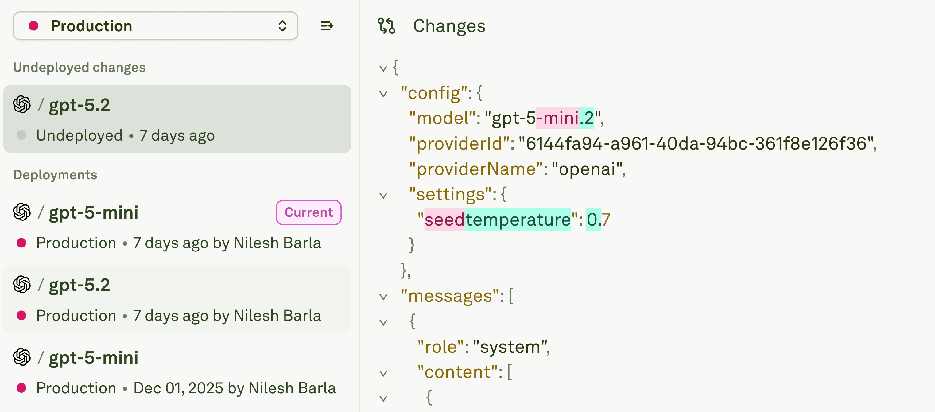 - Deployment discipline: Promote prompts across Dev, Staging, and Production with tracked history and instant rollback.