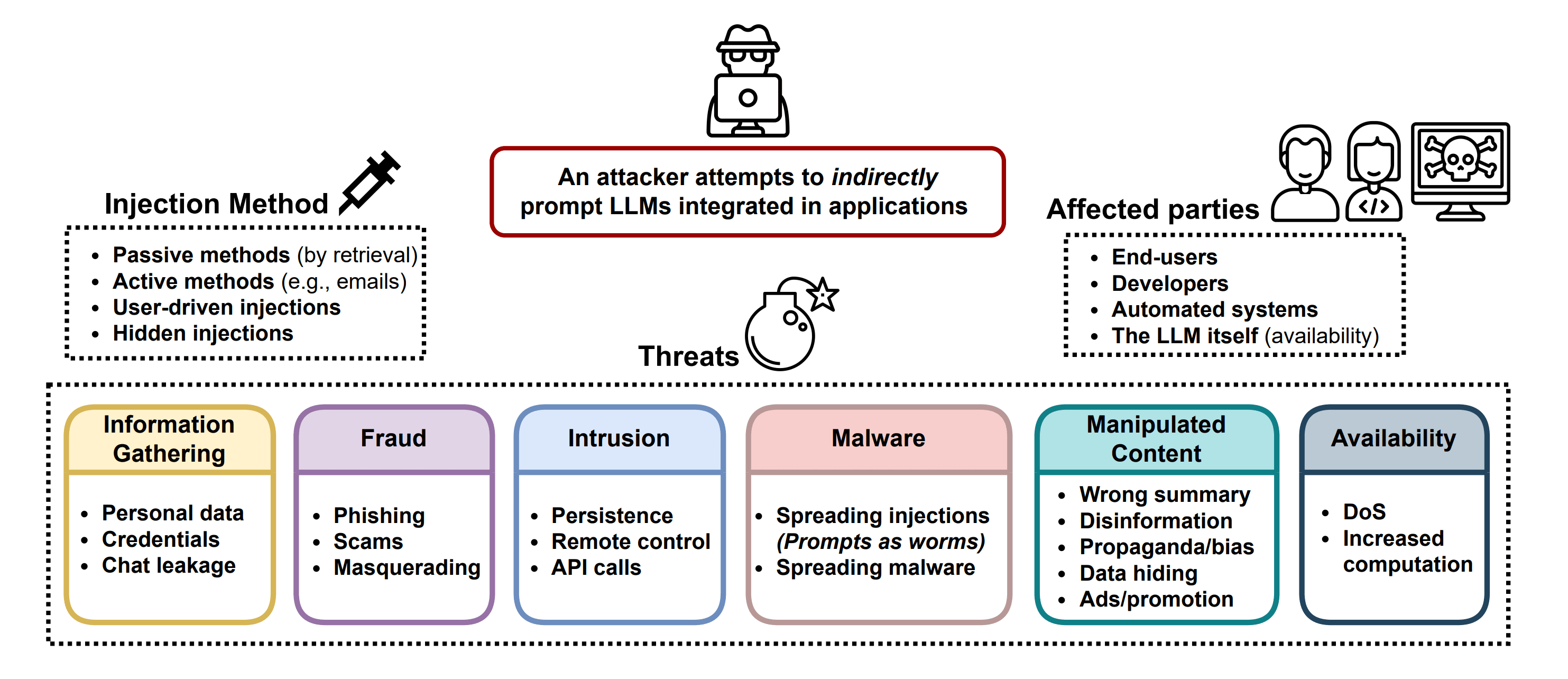 An overview of adversarial attacks to LLM-based applications. | Source: Not what you've signed up for: Compromising Real-World LLM-Integrated Applications with Indirect Prompt Injection