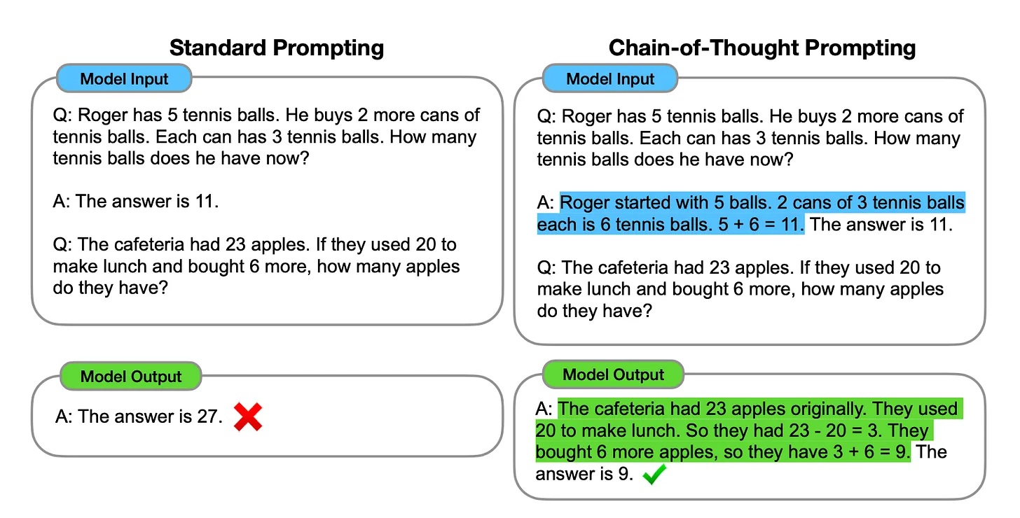 A comparison between standard prompting and chain-of-thought prompting | Source: Chain-of-Thought Prompting Elicits Reasoning in Large Language Models