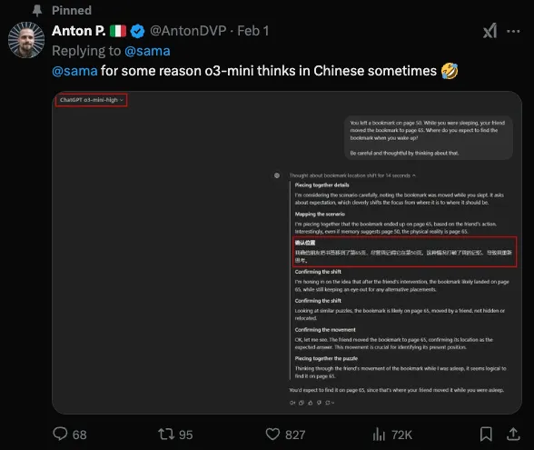 Anton P. said on X that o3-mini-high reasoned in Chinese | Source: ChatGPT o3-mini-high