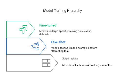 Models tackle tasks without any examples, testing their inherent knowledge and generalization abilities. This approach reveals a model's raw capabilities when facing novel situations. - 2