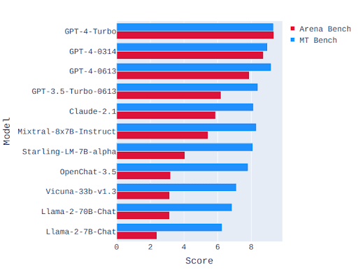 A visual showing the model’s performance between Arena Bench and MTBench. Here the GPT-4 is used as a judge | Source: Chatbot Arena: An Open Platform for Evaluating LLMs by Human Preference