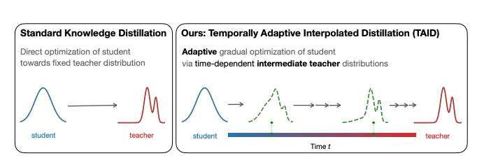 Difference in standard knowledge distillation and TAID | Source: TAID: Temporally adaptive interpolated distillation for efficient knowledge transfer in language models