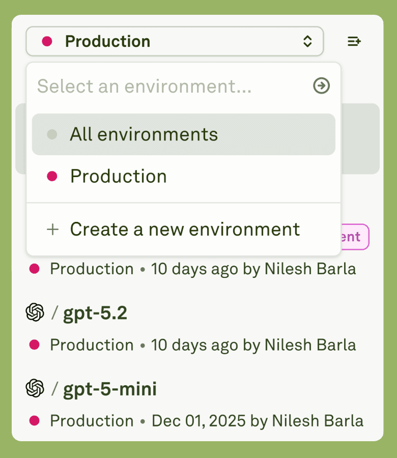 - Prompt release governance: version history, Dev/Staging/Production environments, promotion, and instant rollback.