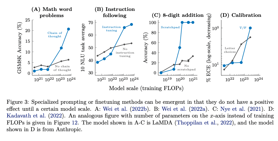 Scaling an LLM encourages emergent behaviour which produces better response from clear prompts. | Source: Emergent Abilities of Large Language Models