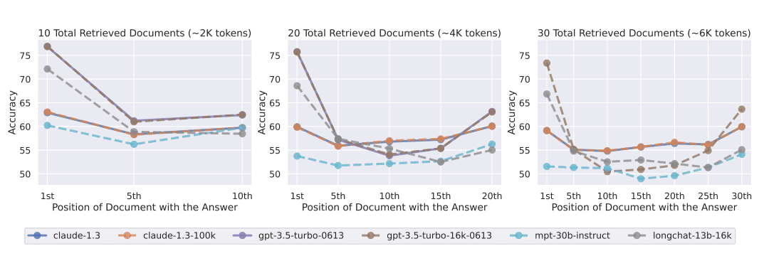 The retrieval strength of the models decreases as the context window increases [see the 10th position]. | Source: Lost in the Middle: How Language Models Use Long Contexts
