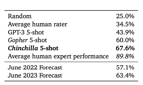 Chinchilla 5-shot accuracy compared to other models including the average human expert performance. | Source: Training Compute-Optimal Large Language Models
