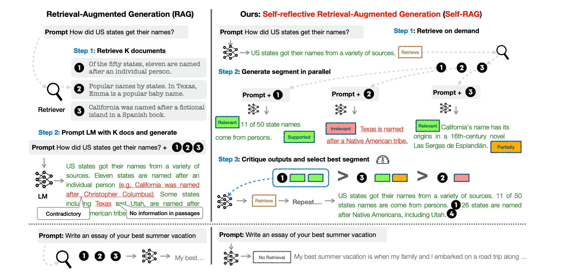 Illustration showing the difference between traditional RAG and Self-RAG | Source: