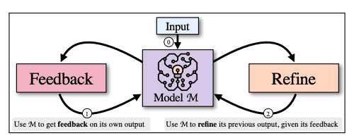 Self-Refine: An iterative process where a language model generates output, critiques its own work, and repeatedly refines it based on self-feedback until completion—all without human assistance. I Source: SELF-REFINE: Iterative Refinement with Self-Feedback