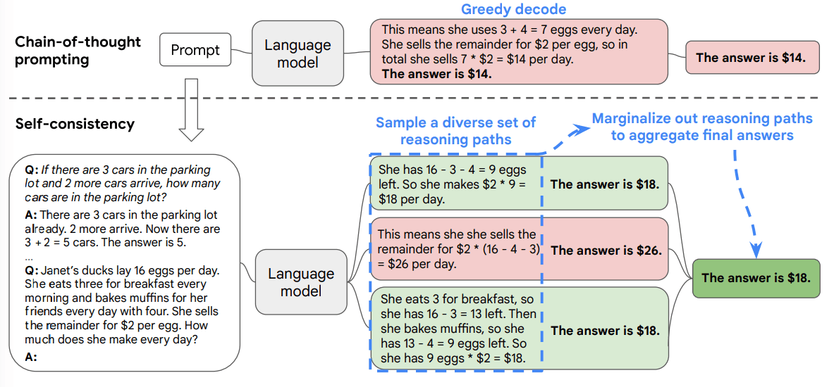 Overview of Self-consistency prompting via three sequential steps | Source: Self-Consistency Improves Chain of Thought Reasoning in Language Models