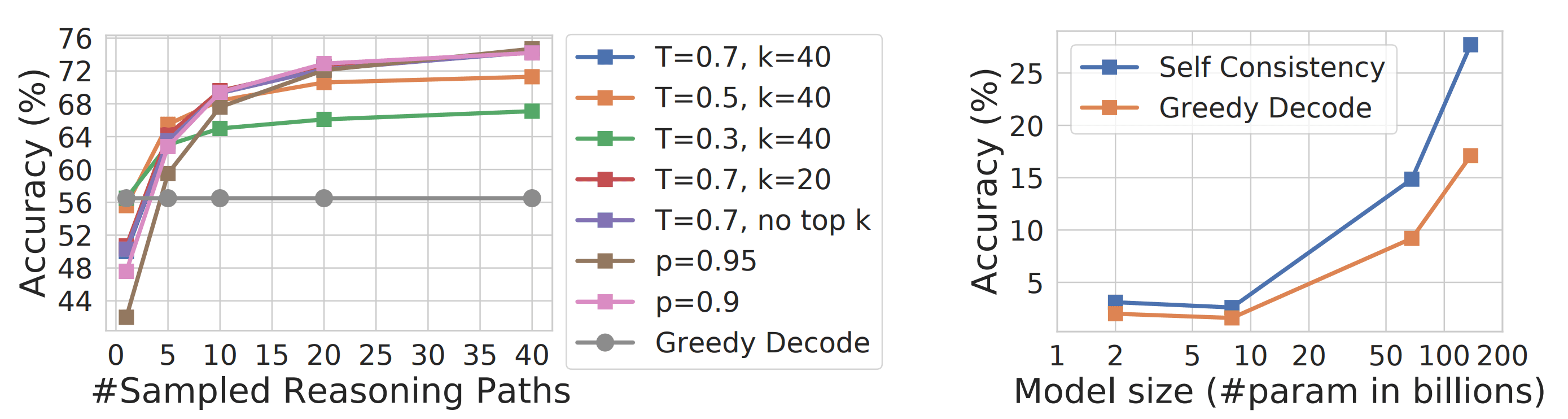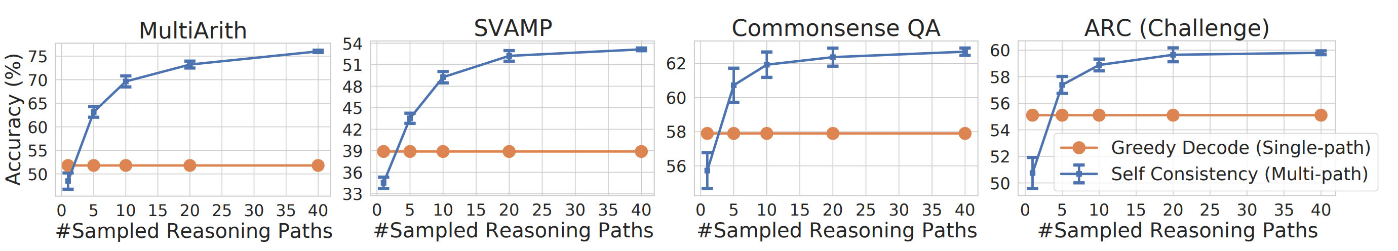 The technique samples multiple paths instead of relying on a single chain of thought. Tests show that increasing the number of sampled reasoning paths improves performance up to a plateau around 40 paths, though most gains emerge with just 5-10 samples.