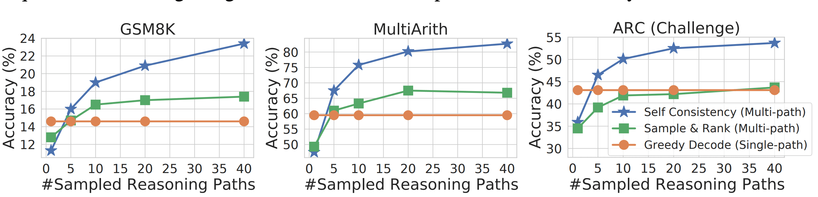 The graphs show better performance of the self-consistency prompting method over sample & rank (multi-path) and greedy decode (single-path) on various benchmarks | Source: Self-Consistency Improves Chain of Thought Reasoning in Language Models