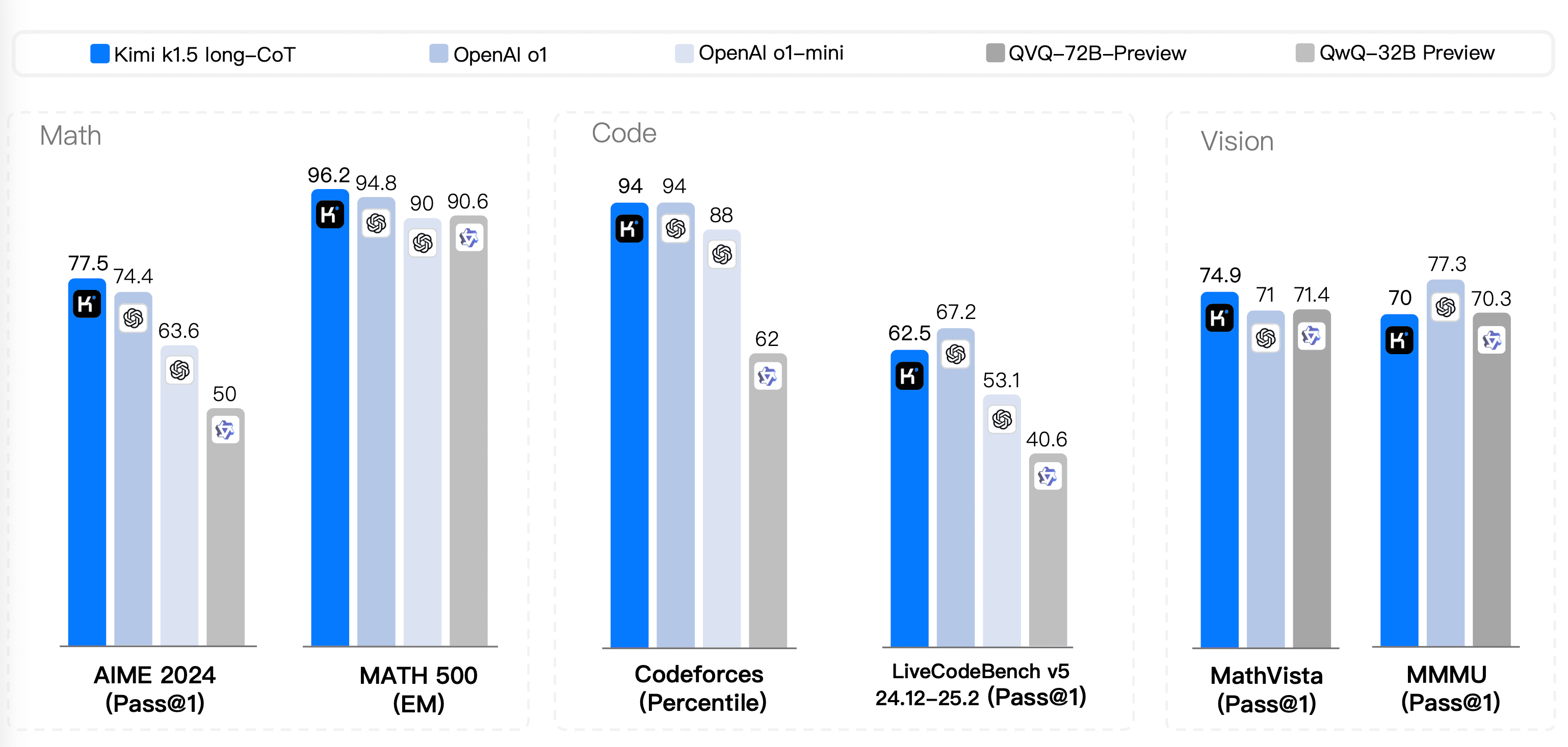 Comparison of various LLMs in different benchmarks with long-CoT | Source: Kimi k1.5: Scaling Reinforcement Learning with LLMs