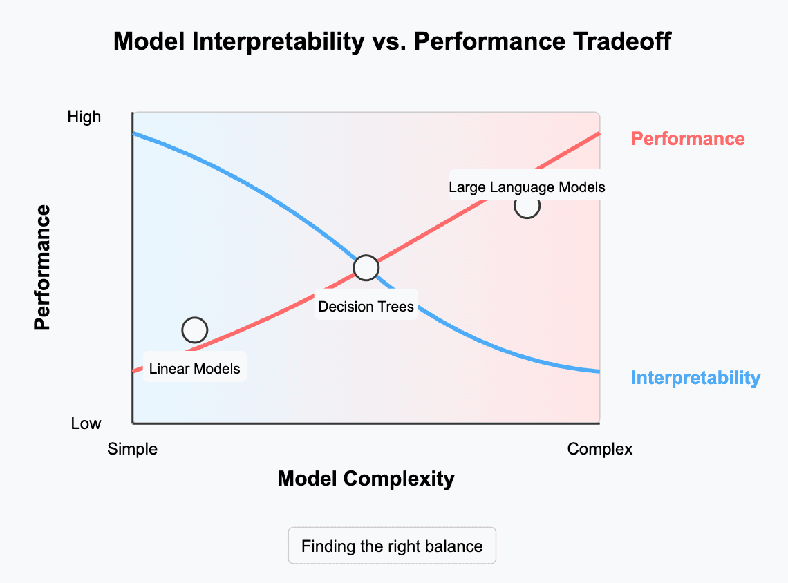 The relationship between model performance and interpretability often involves tradeoffs. Simpler, more transparent models may sacrifice some capabilities that complex "black box" systems can achieve.